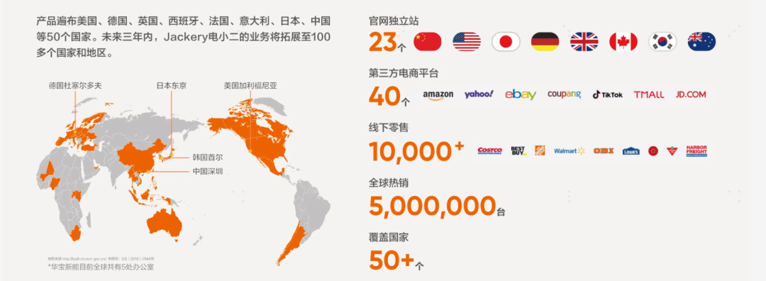 品牌产品已服务50多个国家和地区,立足深圳龙华,并设立美国硅谷、日本东京、德国杜塞尔多夫、澳洲墨尔本等分支机构,运营60多个官网独立站及第三方电商平台,入驻知名零售商HomeDepot、Costco、Target、Bestbuy、Walmart、Bic Camera等超10000家门店,累计销量近600万台,历经14年成功打造了Jackery电小二 Solar Generator专家领导品牌。 华宝新能于2022年9月在中国创业板挂牌上市(SZ301327),成为便携储能第一股。公司全球同仁将持续践行“让绿色能源无处不在”的使命,发展成为全球用户最信赖的绿色能源品牌!
