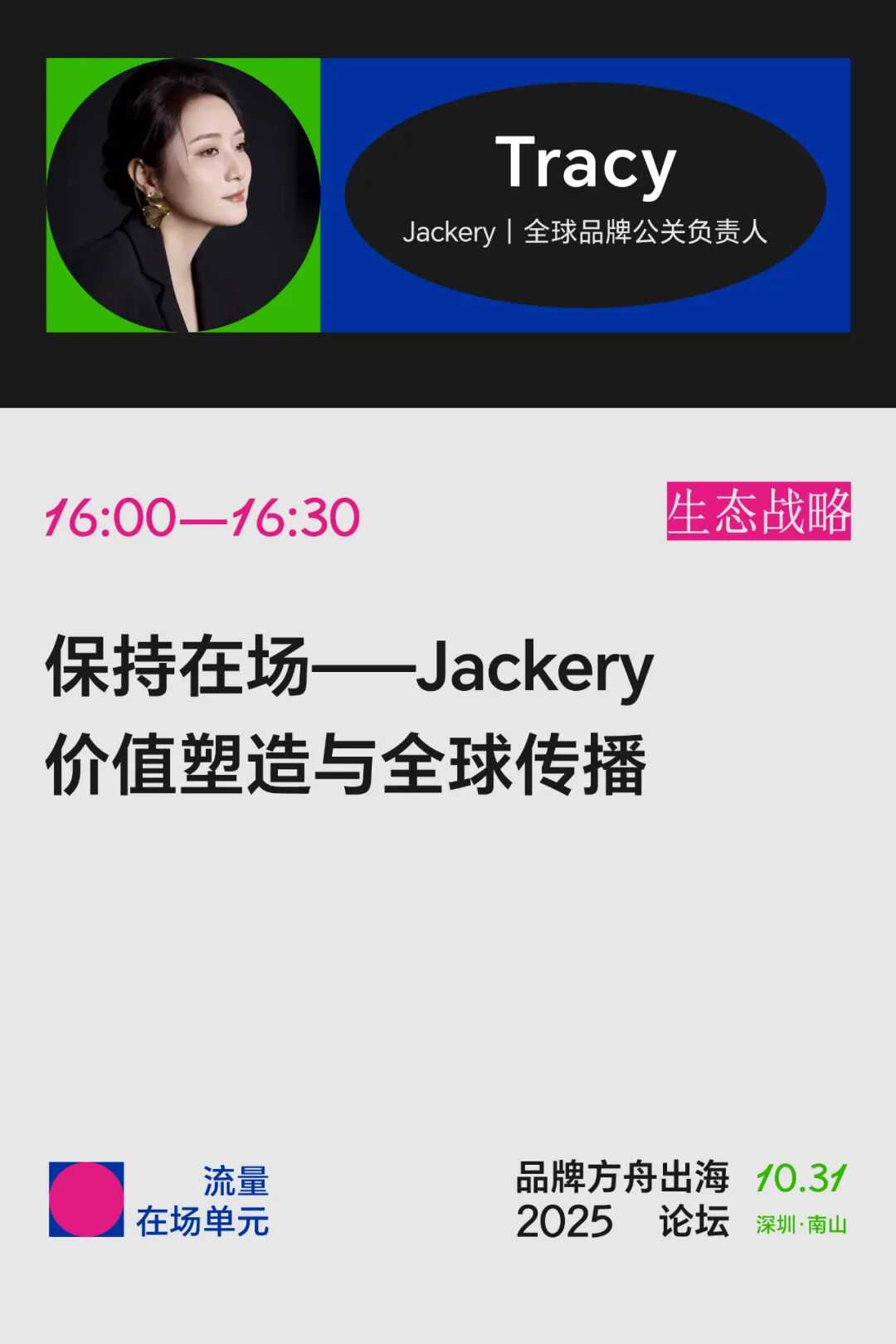 此场大会,Jackery全球品牌公关负责人Tracy将与参会品牌深度对谈,解析Jackery如何超越产品功能,构建“可靠、绿色、探索”的品牌价值内核,并分享其精准触达全球目标圈层的传播策略,如何在全球用户心智中,铸就“户外能源首选”的心智标杆。